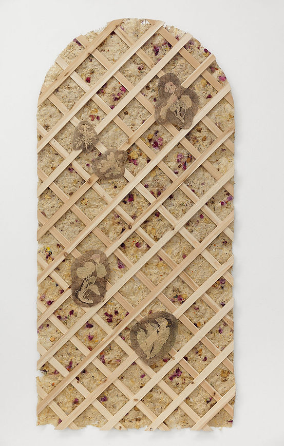 Filling up with joy and tables of edible blooms, 2025, monotype print on hessian, iris leaf paper,